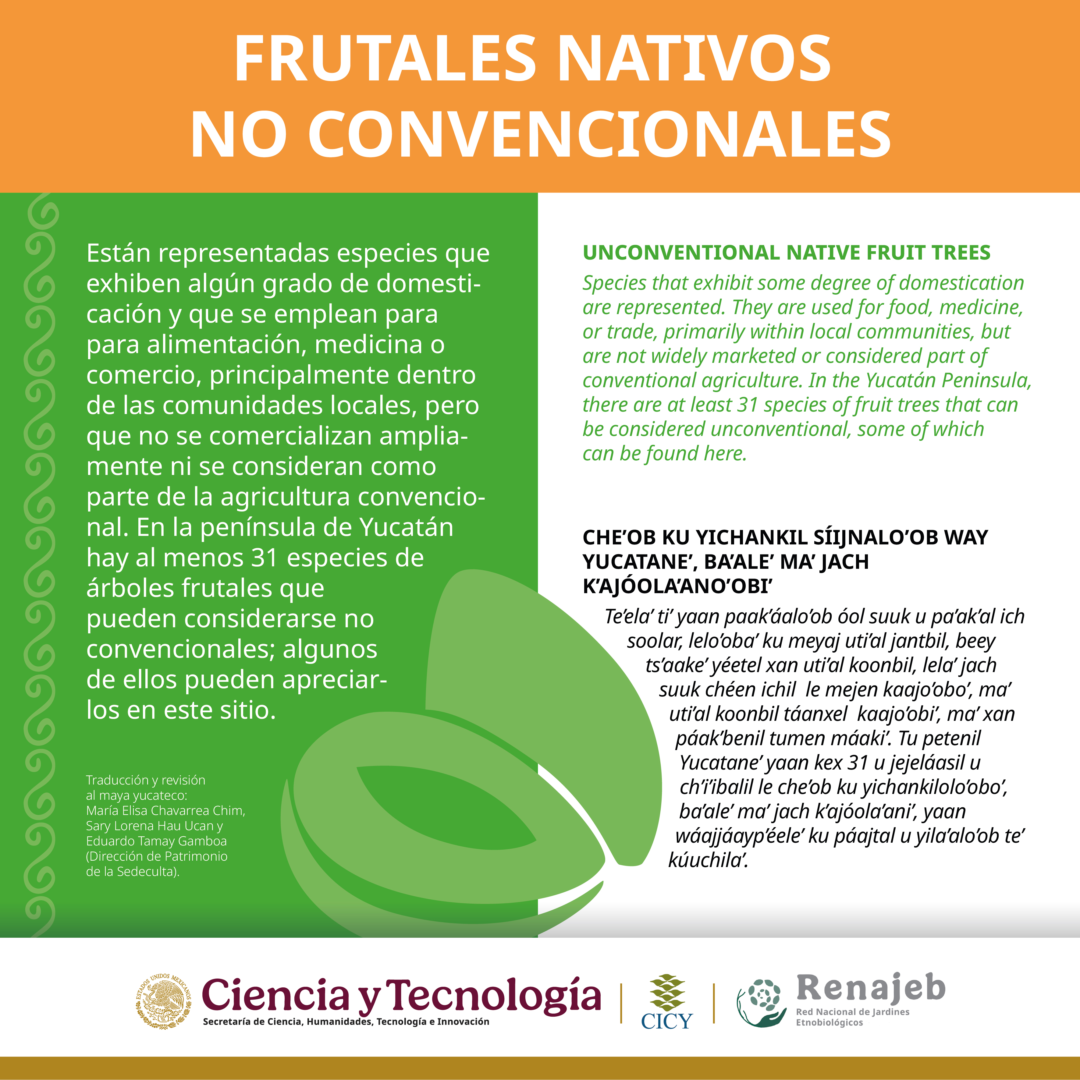En esta colección están representadas 43 especies de frutales, de las cuales 60% son nativas de la región; el 40% restante son especies que durante varios siglos han sido cultivadas en nuestro territorio y que ya son consideradas como propias por las comunidades Mayas. Aquí podrás encontrar especies como: kanisté (Pouteria campechiana), piñuela (Bromelia karatas), saramuyo (Annonna squamosa), pitahaya (Hylocereus undatus) y sak pa (Birsonima bucidaefolia), entre muchas otras.