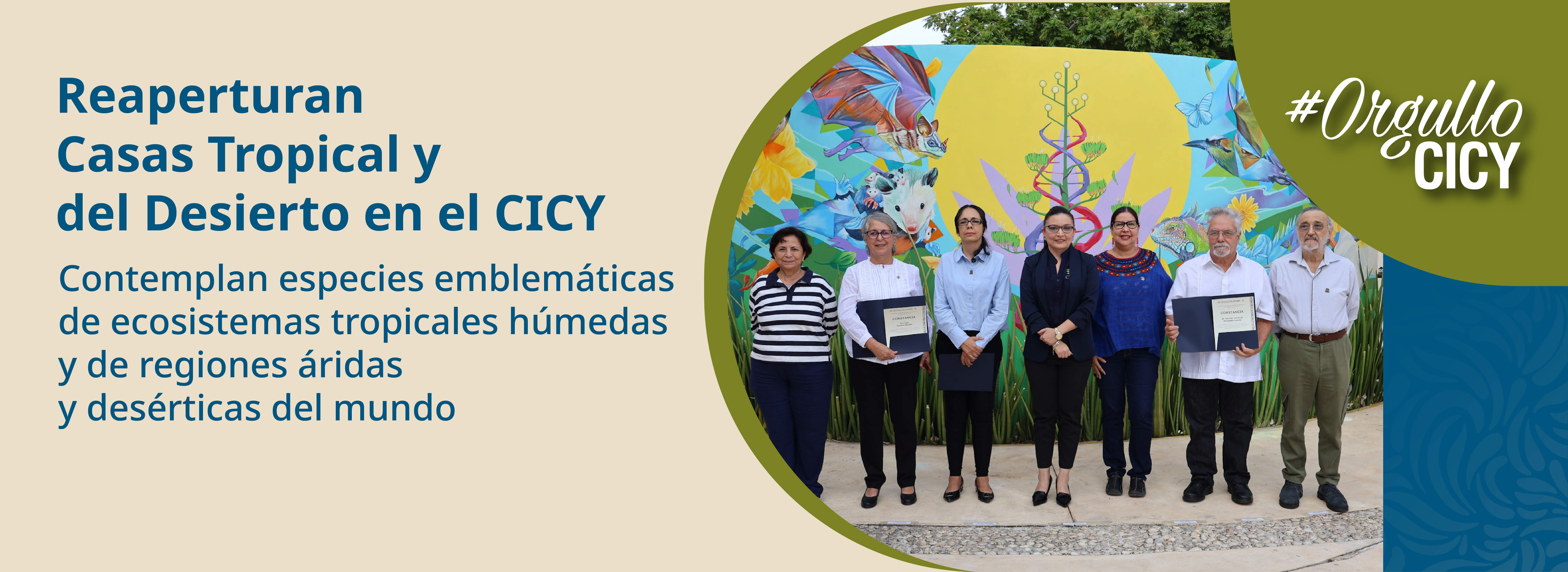 Asimismo, se develó el mural «Flor del Tiempo», una obra del artista Carlos López López que celebra la belleza y diversidad natural que resguarda el JBR-RO.Durante el evento, realizado en el marco de la semana del 46. ° Aniversario del CICY, la Directora General del Centro, Dra. Maira Rubi Segura Campos, reconoció el trabajo y dedicación de los Dres. Ivón Ramírez Morillo y Germán Carnevali Fernández-Concha, curadores de las Casas e Investigadores de la Unidad de Recursos Naturales, por su compromiso en acercar el conocimiento sobre la flora de México y del mundo. Asimismo, por ser los impulsores del proyecto “Polo para la conservación y la educación ambiental en el Jardín Botánico Regional Roger Orellana” de donde derivaron las colecciones: Casa del Desierto y la Casa Tropical.